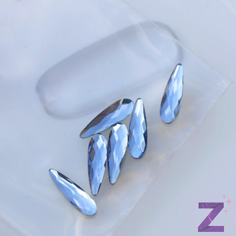 Csepp alakú formakő körömdísz 10*3mm-es light sapphire színben. Alján fólia nélküli, hosszú körömdíszítő cseppforma. Flatback ragasztható üveg körömdísz.