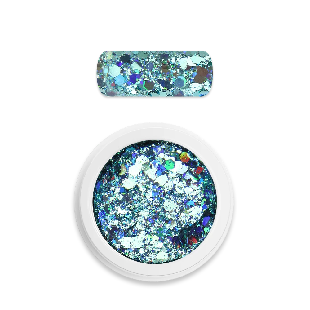 Különlegesen szép és csillogó, intenzív holografikus fénnyel ragyogó finom őrlésű csillámpor és hexagon glitter keveréke. A kisebb és nagyobb szemek együtt extra ragyogást biztosítanak. Gyönyörűen mutat a köröm teljes felületén, vagy kiegészítő díszítésként. Használható körömlakk és lakkzselé ragacsos felületén, fényzselébe, építő- és ragasztózselébe vagy porcelánba keverve egyaránt. A tartósság érdekében érdemes fedni.