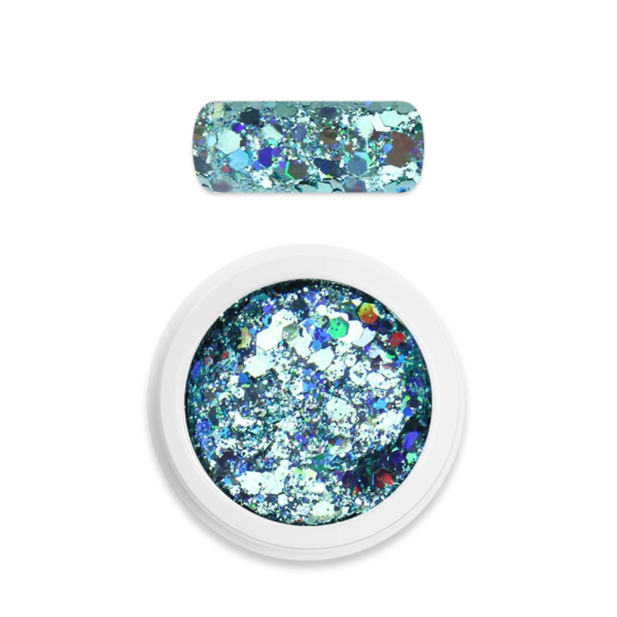 Különlegesen szép és csillogó, intenzív holografikus fénnyel ragyogó finom őrlésű csillámpor és hexagon glitter keveréke. A kisebb és nagyobb szemek együtt extra ragyogást biztosítanak. Gyönyörűen mutat a köröm teljes felületén, vagy kiegészítő díszítésként. Használható körömlakk és lakkzselé ragacsos felületén, fényzselébe, építő- és ragasztózselébe vagy porcelánba keverve egyaránt. A tartósság érdekében érdemes fedni.
