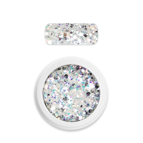 Különlegesen szép és csillogó, intenzív holografikus fénnyel ragyogó finom őrlésű csillámpor és hexagon glitter keveréke. A kisebb és nagyobb szemek együtt extra ragyogást biztosítanak. Gyönyörűen mutat a köröm teljes felületén, vagy kiegészítő díszítésként. Használható körömlakk és lakkzselé ragacsos felületén, fényzselébe, építő- és ragasztózselébe vagy porcelánba keverve egyaránt. A tartósság érdekében érdemes fedni.