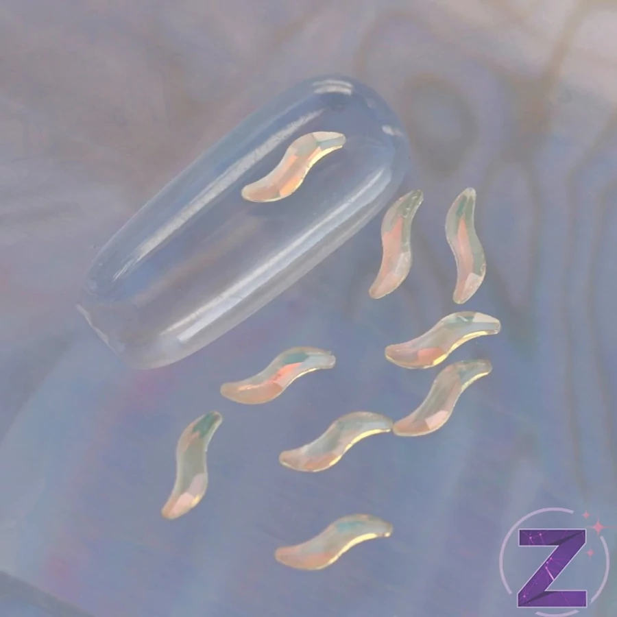 Strassz formakő. wave, -hullámforma, peach opálos-krémes színű színváltó üveg körömdísz. Lapos aljú, fóliázott üvegforma.