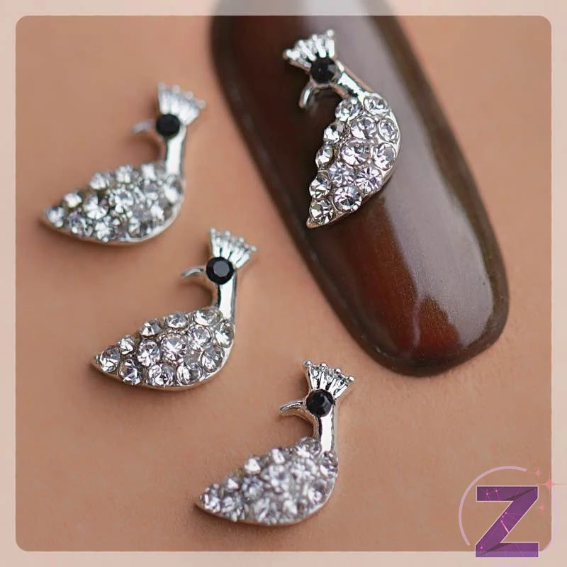 Strasszköves körömdísz ezüst színű fém fácán forma, crystal színű strasszkövekkel díszítve. Rögzítéséhez glue gélt ajánljuk. Önmagában is feltűnő díszítő.